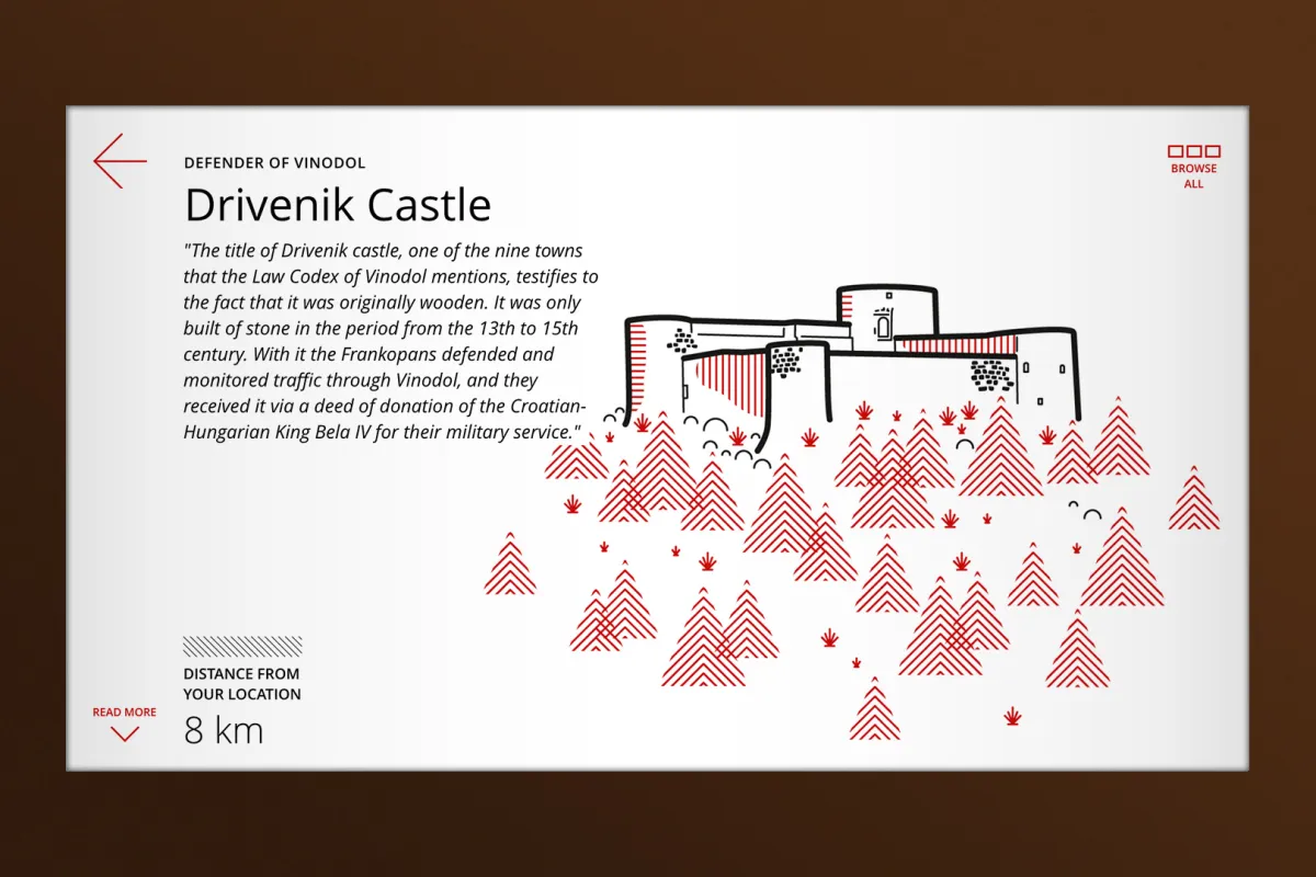 Posjetiteljski centar Nova Kraljevica kao i sedam novih interpretacijskih centara na ruti sadrže i brojne multimedijske aplikacije, od funkcionalnih koje predstavljaju točke na ruti do iskustvenih kao što su frankopanska gatalica, chat s puhom čuvarem dvorca, animirani prikaz prenošenja Marijine kućice iz Nazareta na Trsat u proširenoj stvarnosti, rekonstrukcija Krbavske bitke i mnoge druge. Izazov je bio oblikovati korisničko iskustvo koje će funkcionirati kvalitetno sa širokim rasponom raznolikog sadržaja za različite dobne skupine i tehnološke vještine posjetitelja.