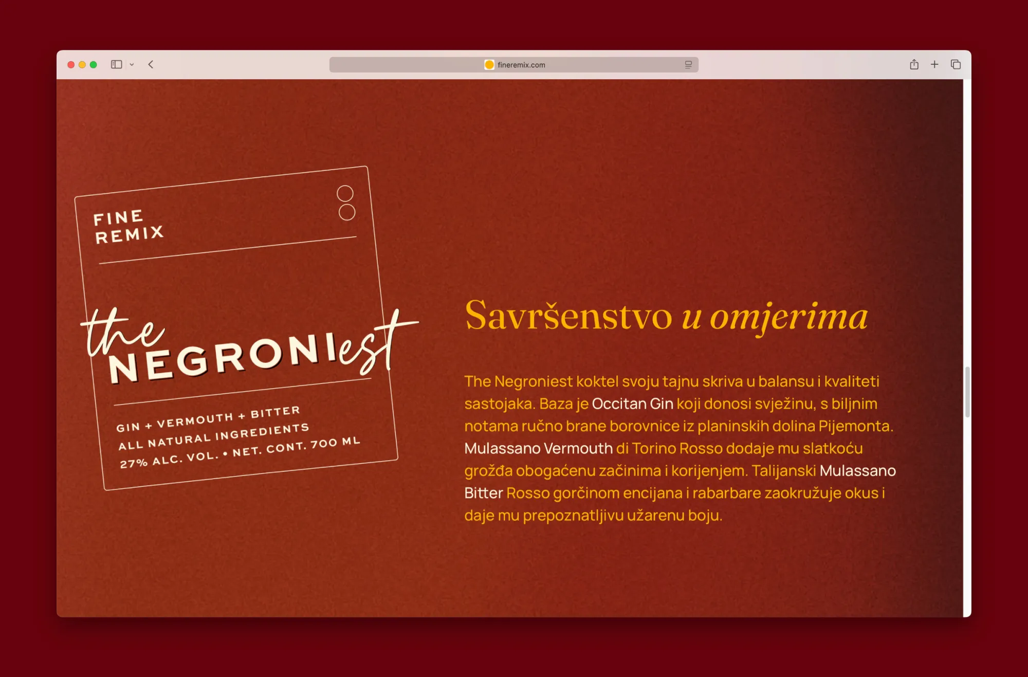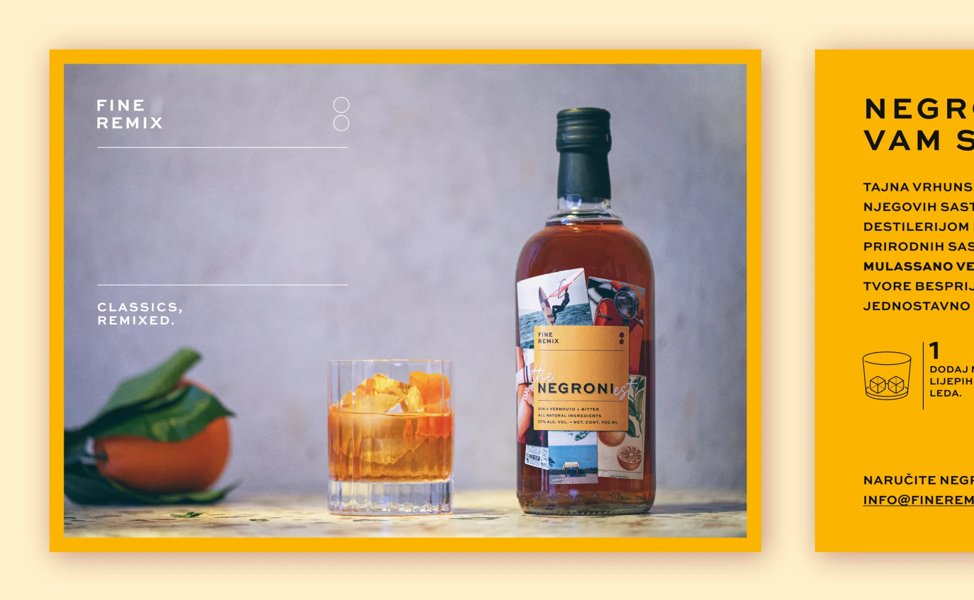 As the country's chief selector of fine drinks, Fine stvari launched a new brand of pre-batched cocktails made in Italy. Fine remix, in that sense, is a logical step forward in the company's approach to the FMCG B2B and B2C market that serves the audience that appreciates a fine cocktail without the need to have different ingredients nor equipment to make a fine cocktail at home or in a bar.