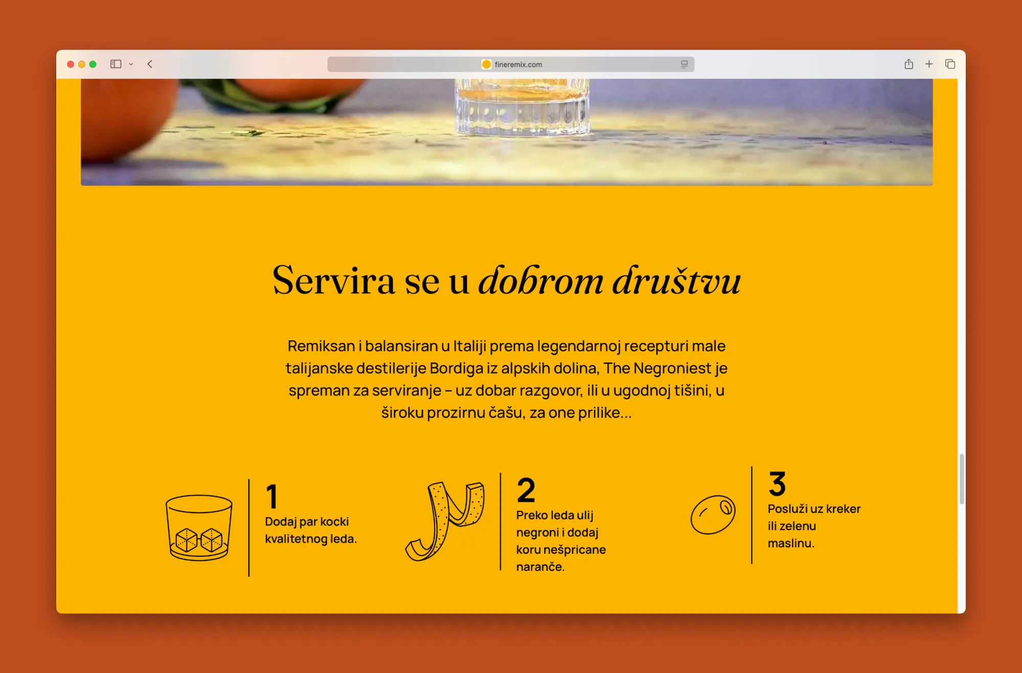 The name of the brand communicates a new perspective on the cult classics like Negroni, Manhattan, Martini and so on while the first in the series is The Negroniest, evoking the emotions of the Adriatic and Meditteranean glamour, spontaneus social mingling, with a hint of nostalgia.