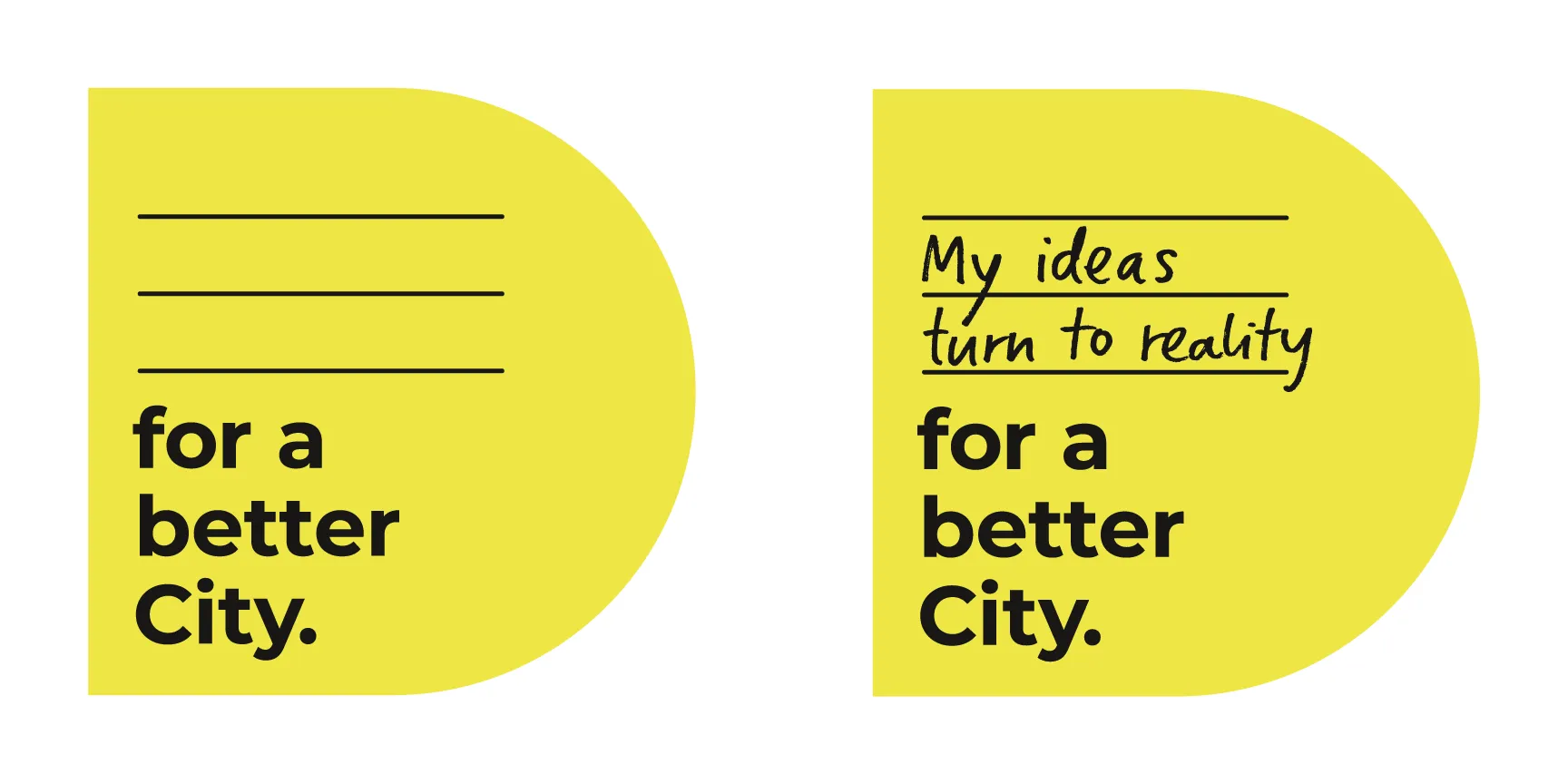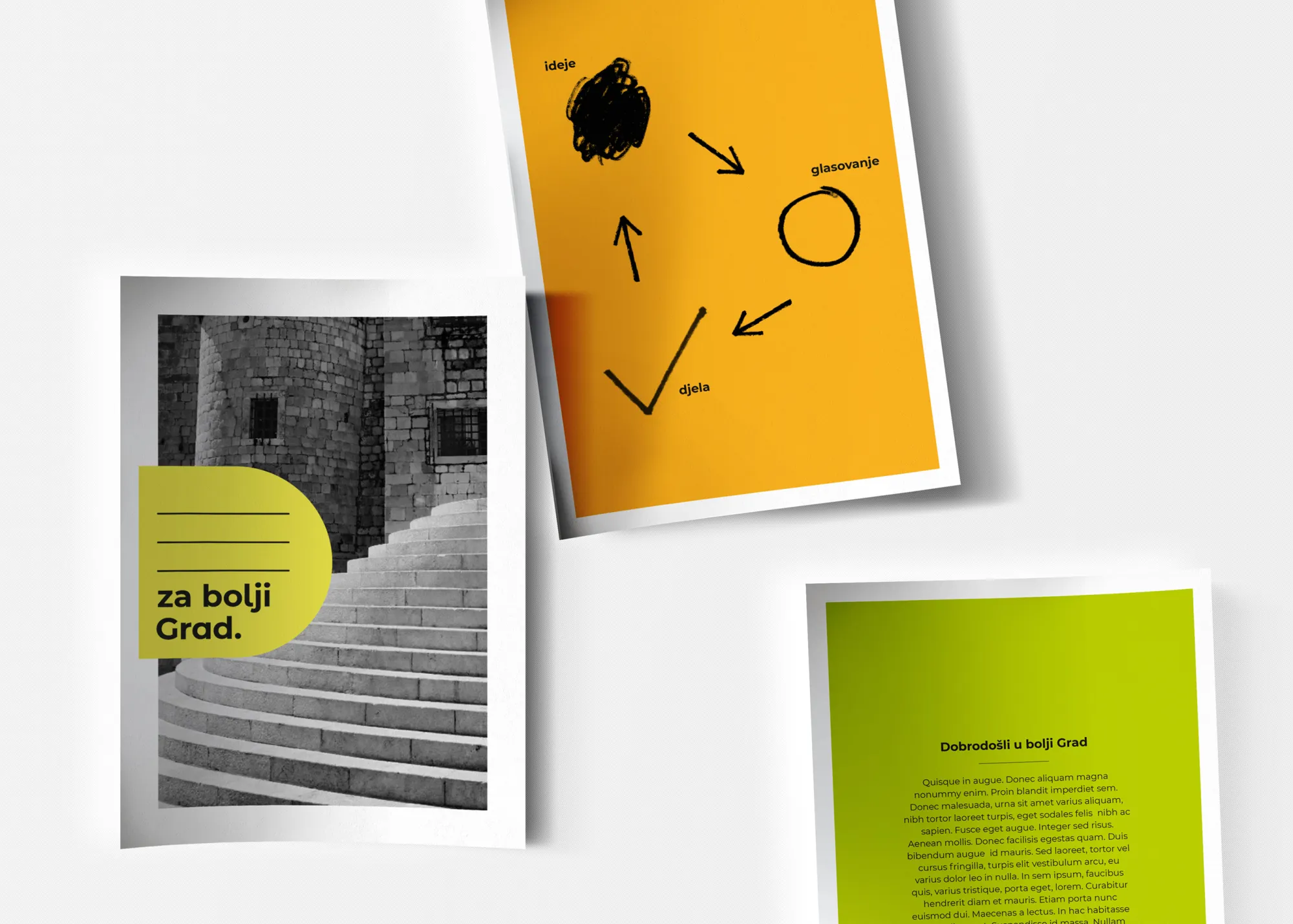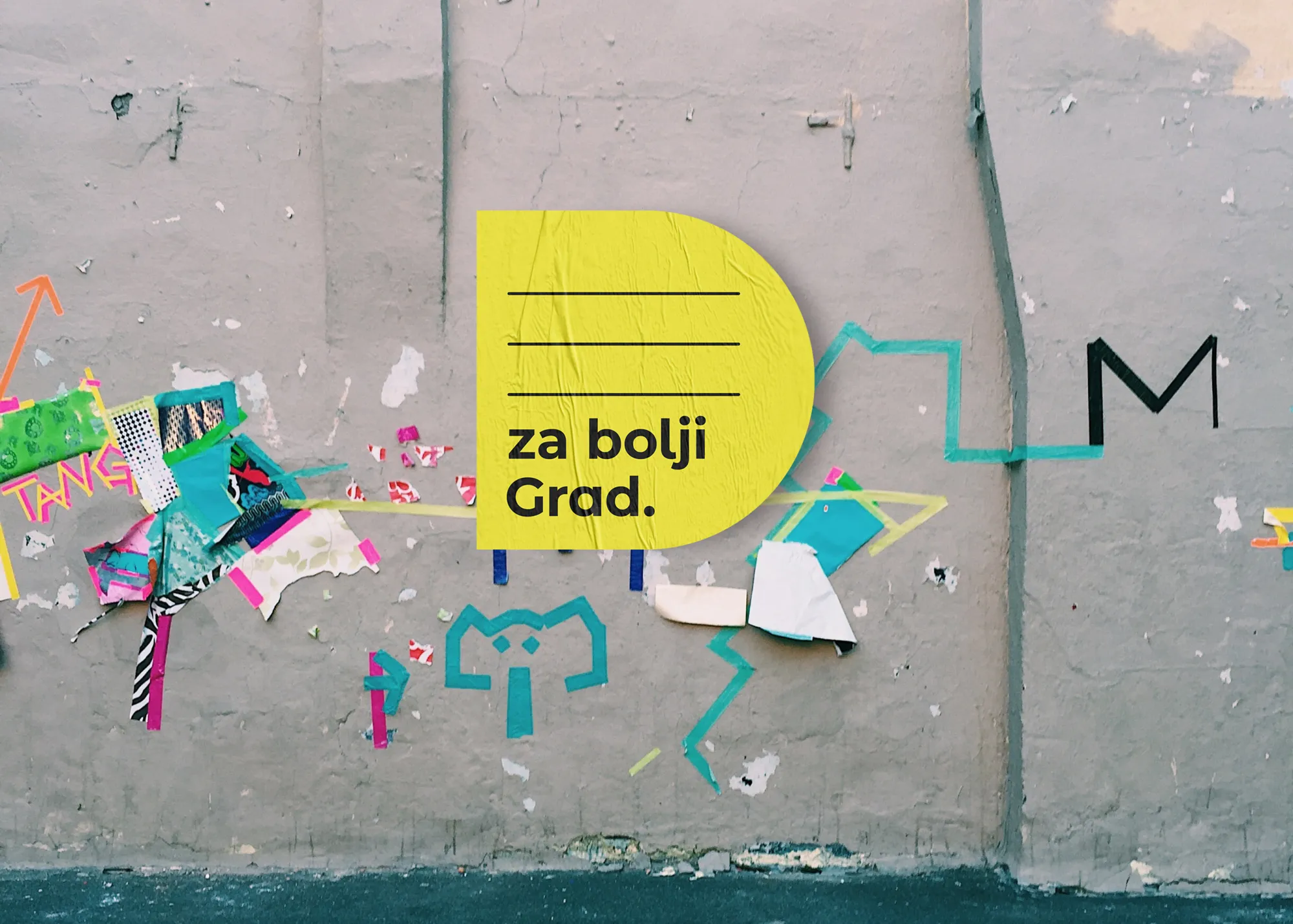 The name "for a better City" in Croatian uses local Dubrovnik dialect and provokes dialogue by asking: "what would you do for a better City?" By using blank lines in front of the name of the project, visual design inspires proactive thinking which happens in a stylized area of the letter "D".