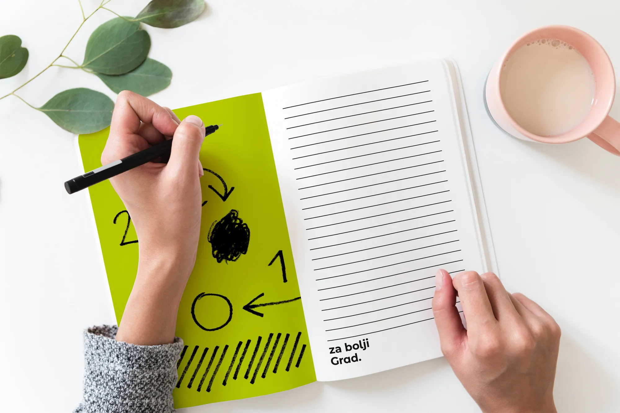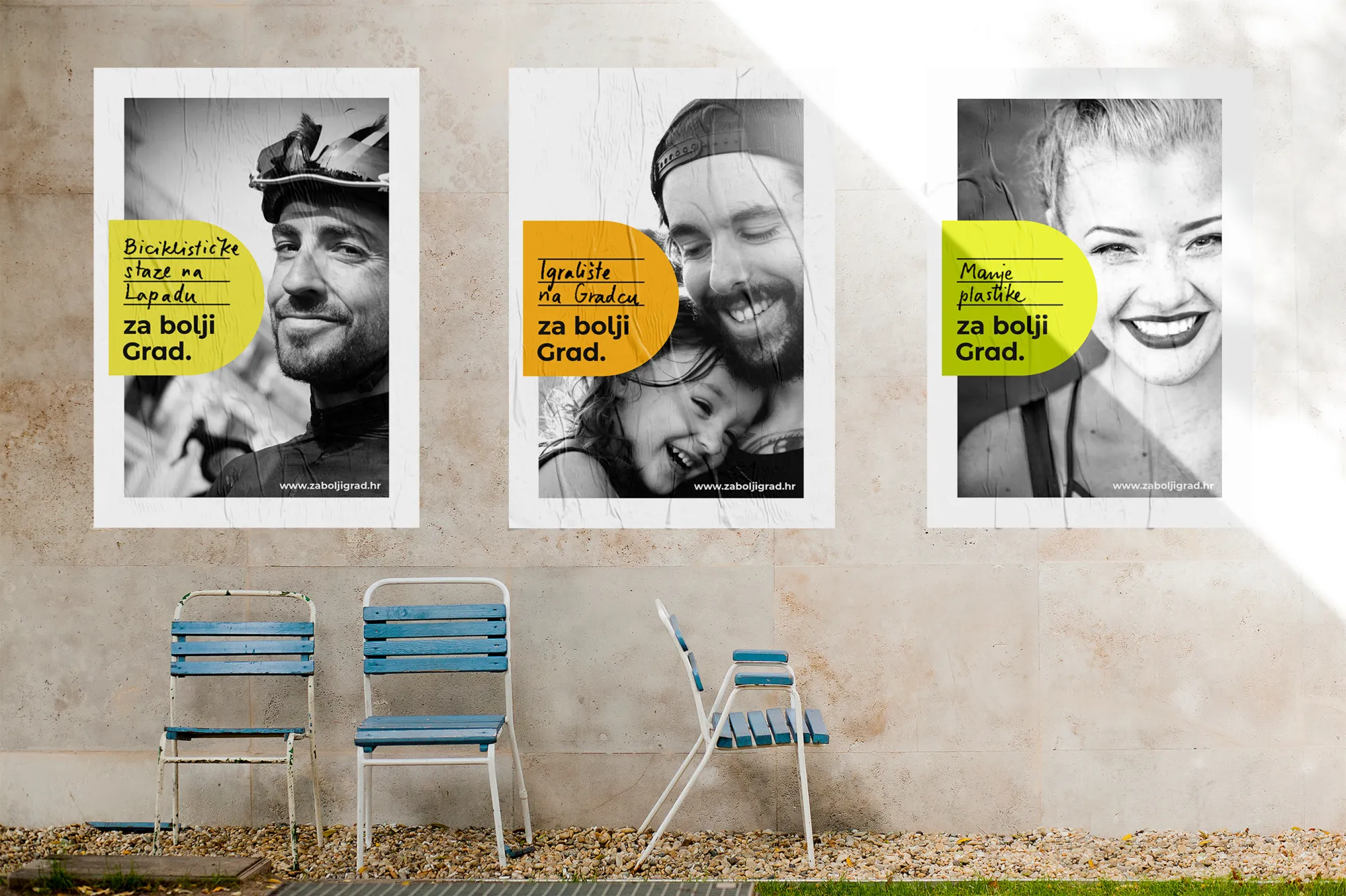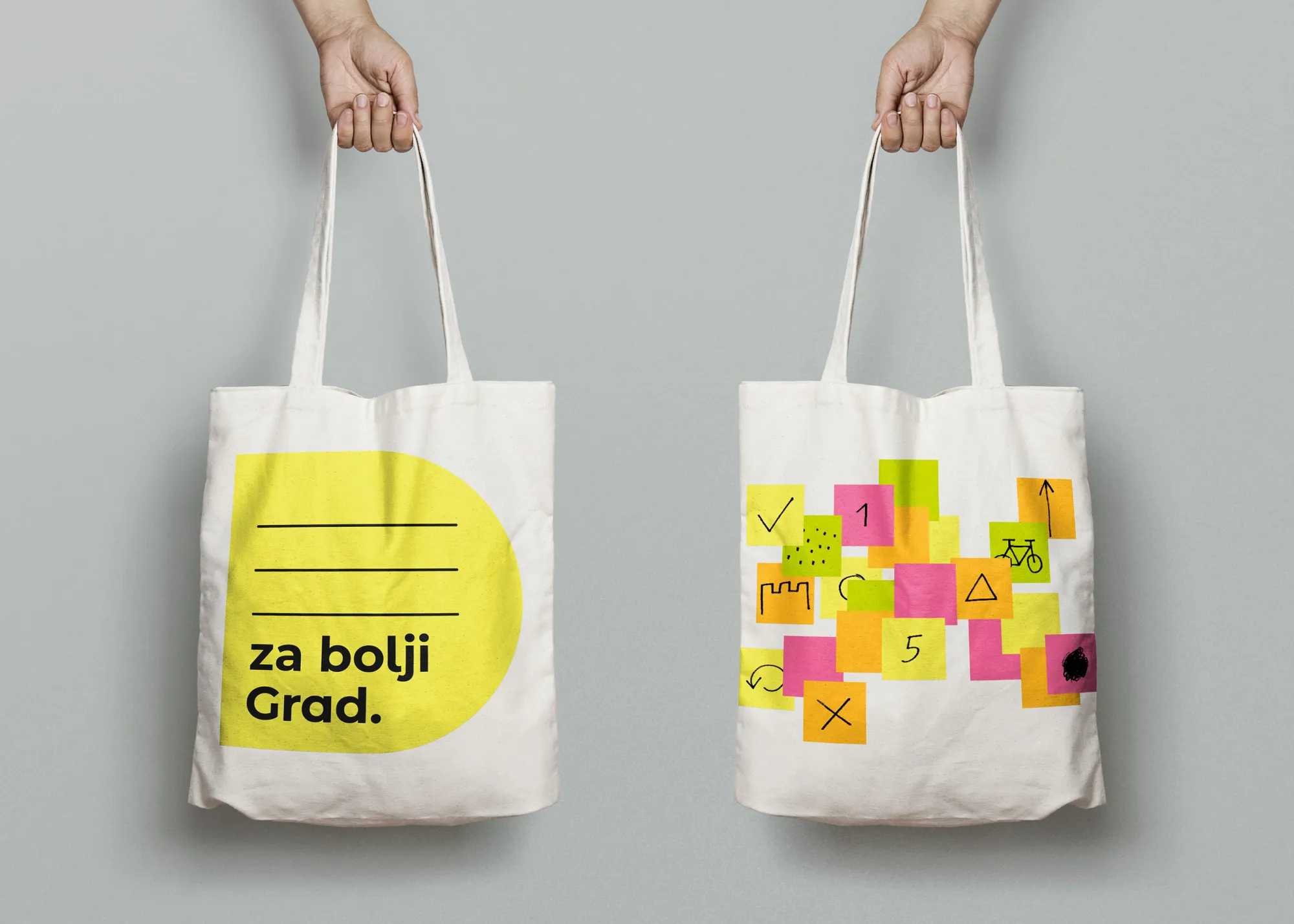 The name "for a better City" in Croatian uses local Dubrovnik dialect and provokes dialogue by asking: "what would you do for a better City?" By using blank lines in front of the name of the project, visual design inspires proactive thinking which happens in a stylized area of the letter "D".
