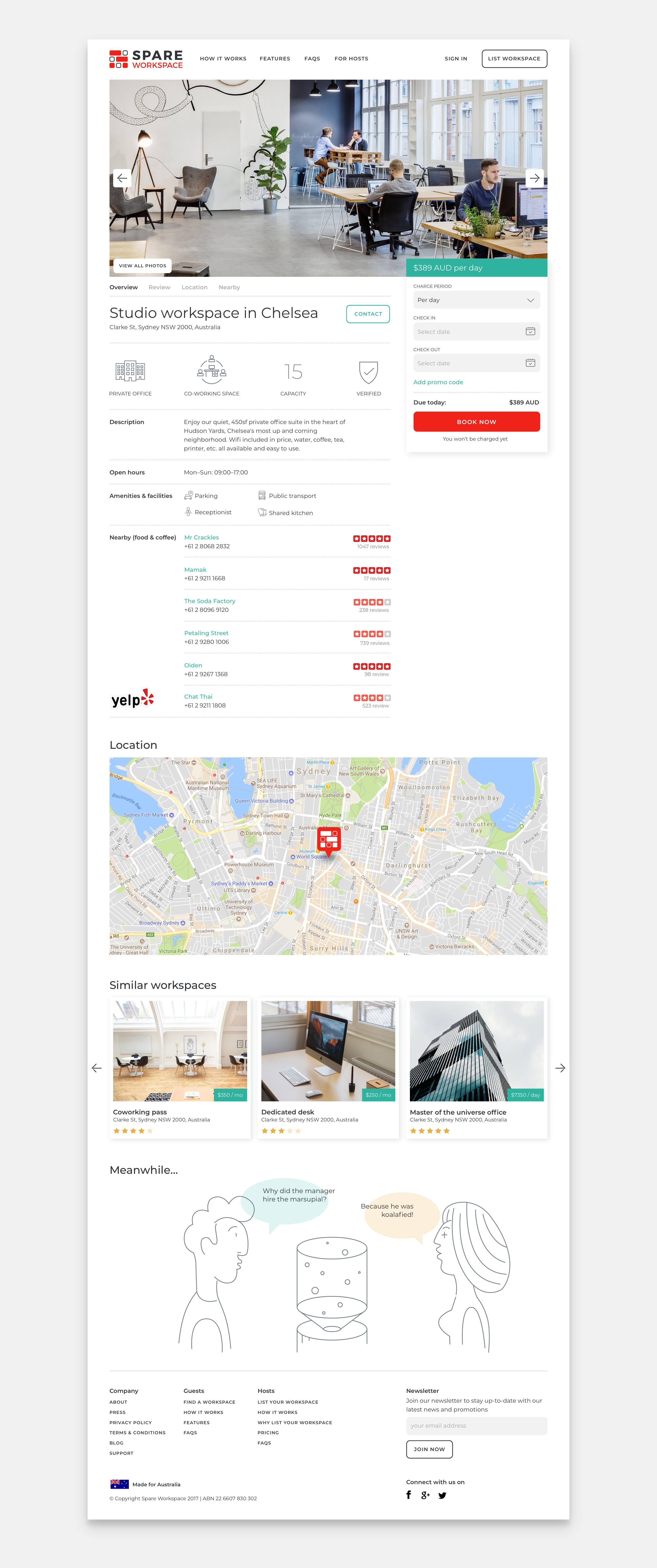Spare Workspace is an Australia-based online marketplace that makes it easy for people looking for short-term workspace to connect with others who have a workspace to share. This B2B product targets co-working spaces, serviced offices, and private businesses with extra space as hosts, and digital nomads, remote corporate employees, and business travellers as guests.