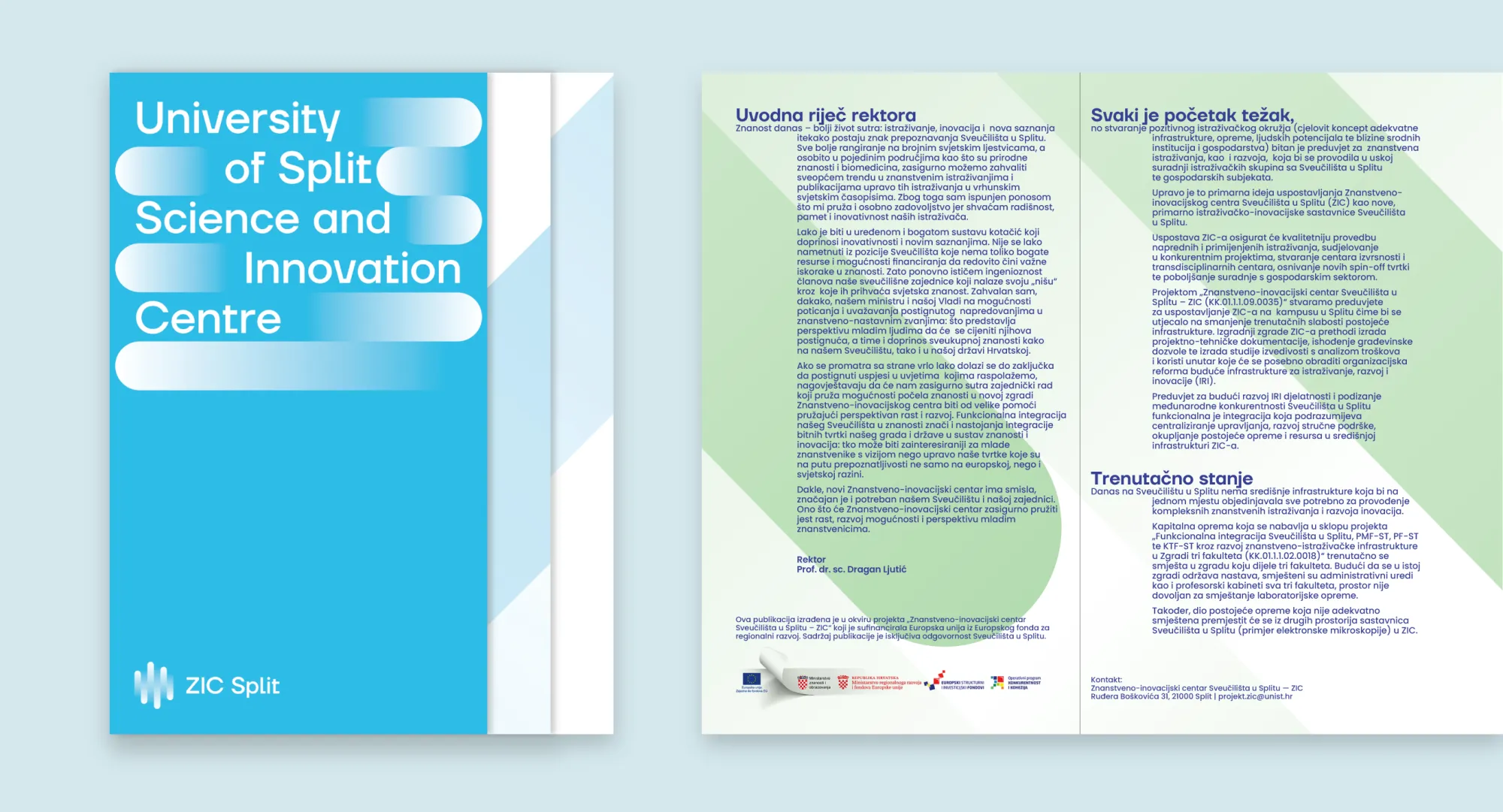 The University of Split has initiated the founding of a Science and Innovation Centre to become an incubator of excellence in scientific research. Its research activities will be directed towards solving various social challenges in the fields of energy, environment, food and nutrition, health, safety, and connectivity with the aim of achieving a sustainable, circular, and blue economy. Filburg designed its visual identity and a promotional brochure that presents the project in its early stage.